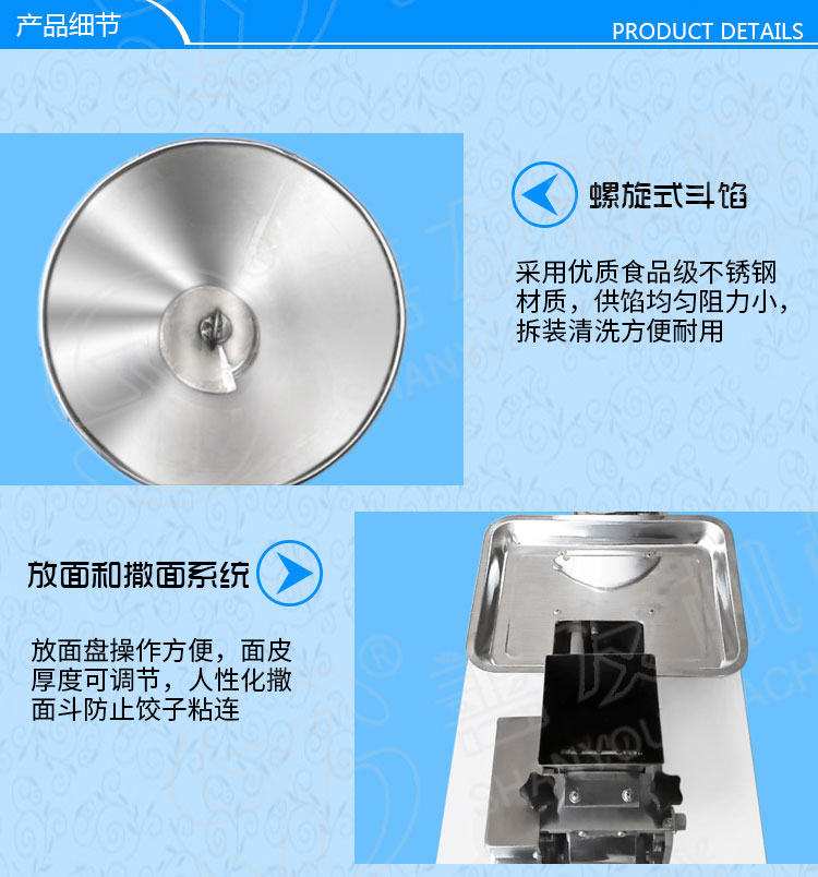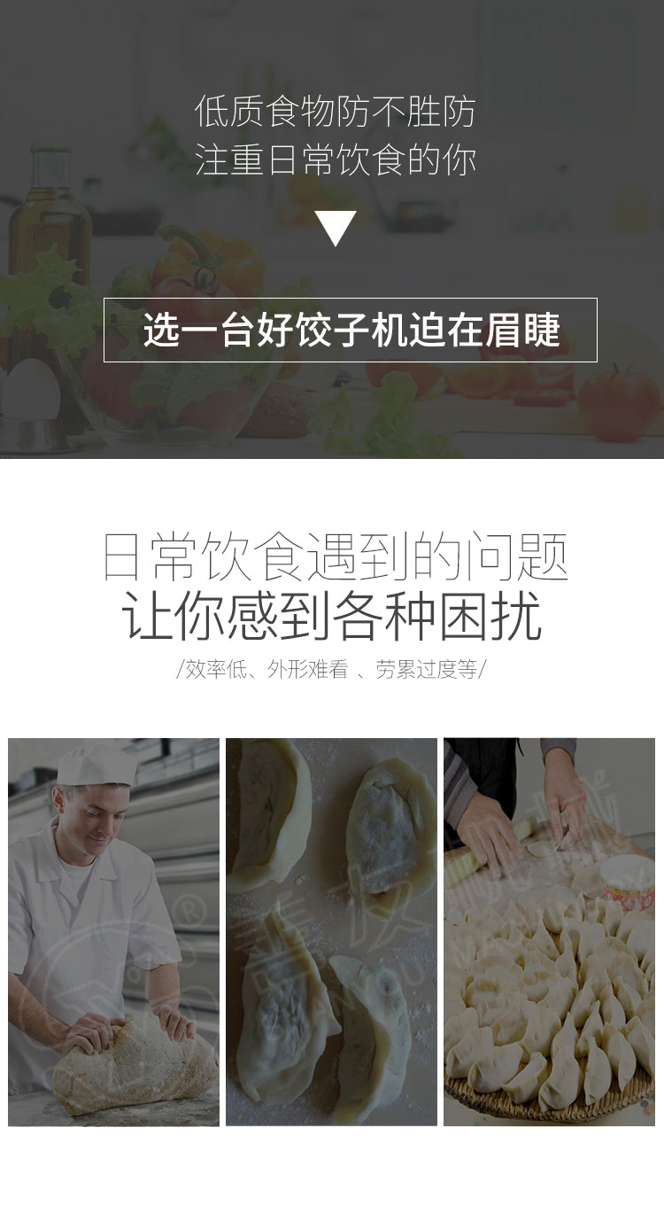 1、 一机多用途:只要更换模具,就可以制造不同的食品:春卷、馄饨、火锅水饺、珍珠水饺、咖喱饺子、花边饺子、锅帖饺子。